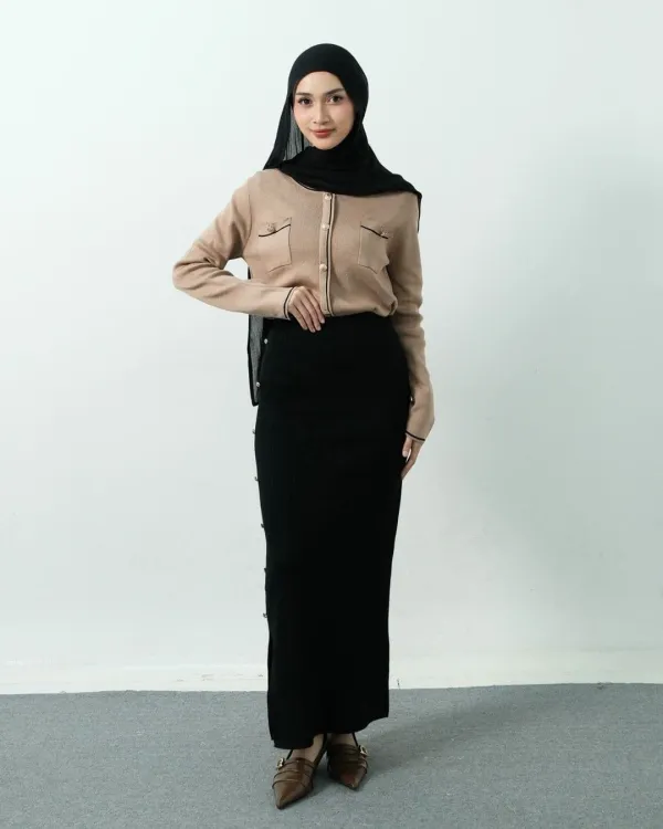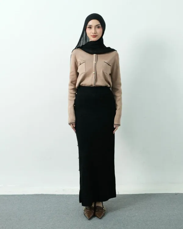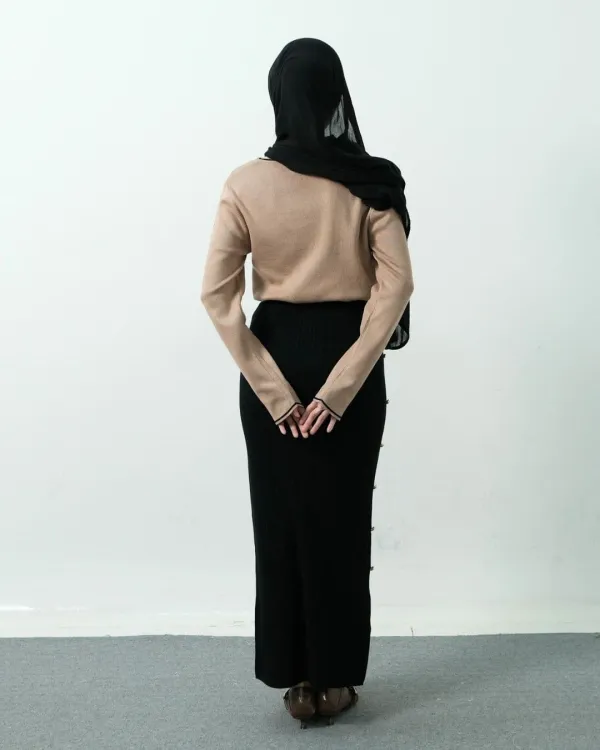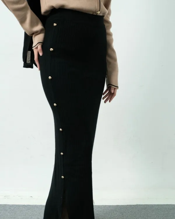 Arianna Long Bodycon Knit Skirt Gold Buttons (Special Black)