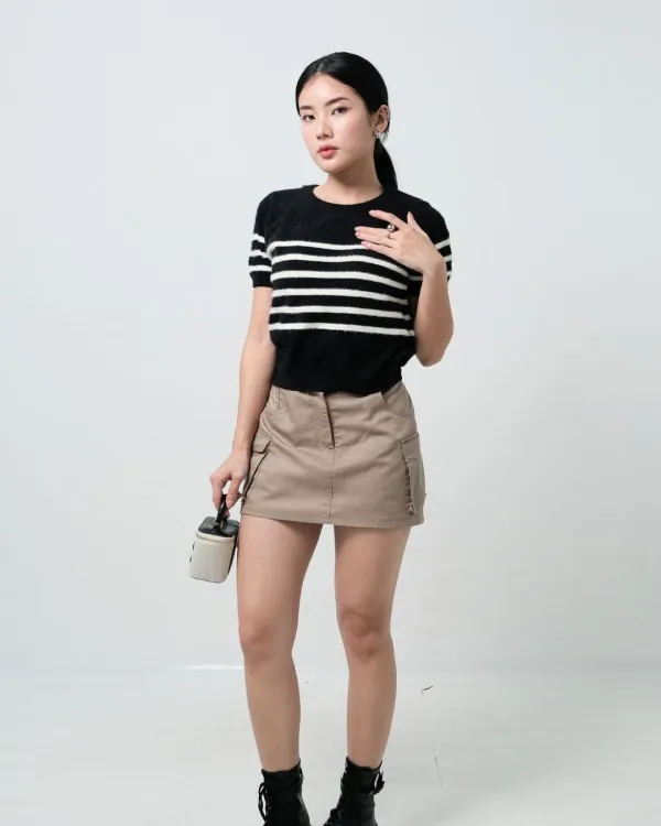Navisha Short Sleeve Stripe Fuzzy Top