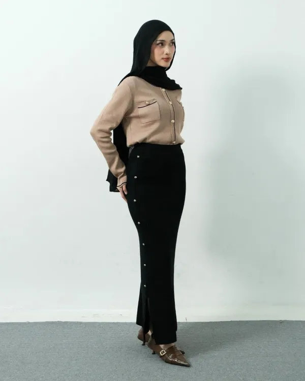 Arianna Long Bodycon Knit Skirt Gold Buttons (Special Black)